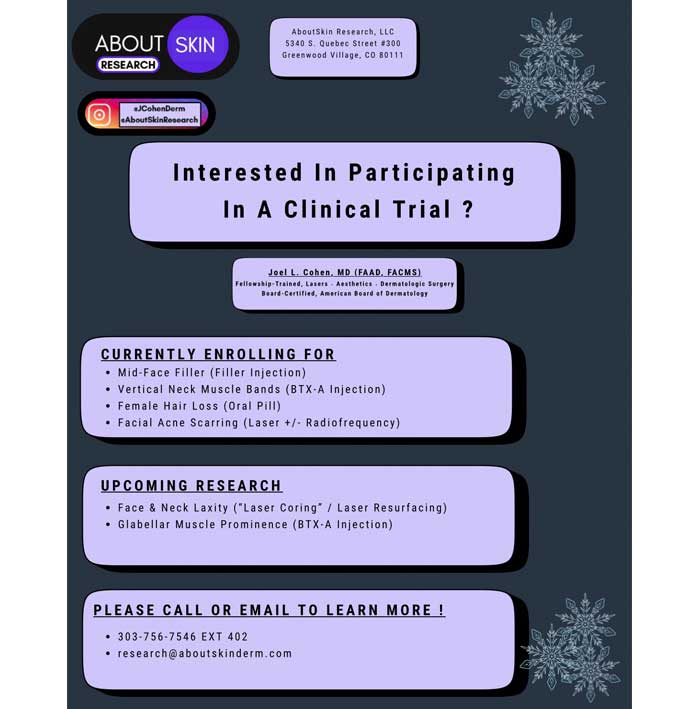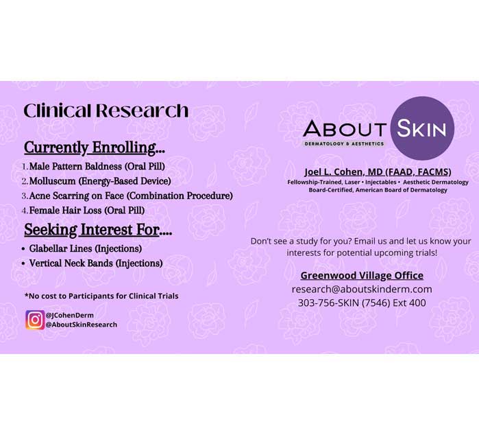 *No cost to Participants for Clinical Trials at: AboutSkin Dermatology and DermSurgery, PC